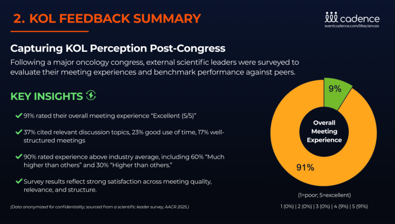 From one of our clients, over 90% of surveyed KOLs rated their experience “Excellent,” with many citing relevant discussion topics and well-structured meetings. Beyond satisfaction scores, this kind of feedback helps organizations understand how they stack up against peers and where they can differentiate future engagements.