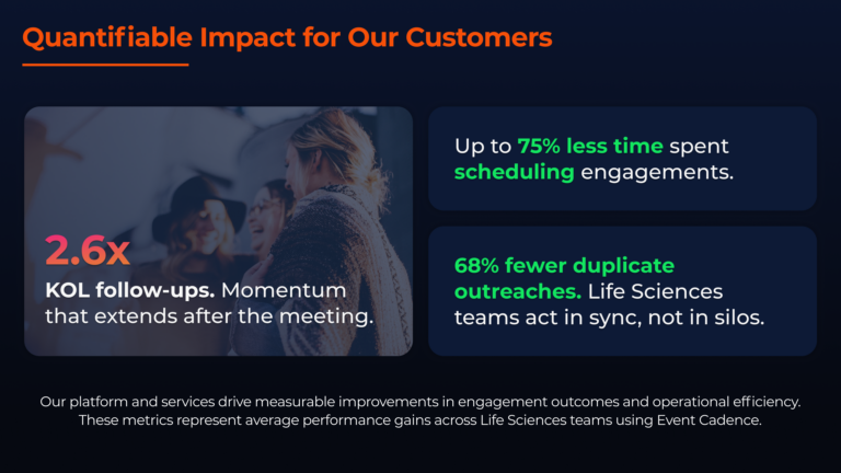 Event Cadence is the leading engagement lifecycle platform built for life sciences. From global congresses to one-on-one HCP meetings, our solutions bring structure, visibility, and intelligence to every interaction. With tools like the Appointments and Engagements Suite and Ensemble, teams can plan, execute, and measure with precision, ensuring every meeting drives impact.